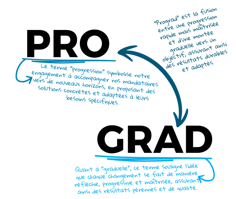 Le nom de notre antenne Prograd est issu de la contraction de “Progression” et “Graduelle”. Cette notion incarne l’essence même de notre approche : accompagner les bénéficiaires dans une évolution continue, à travers des étapes claires, adaptées à chaque situation et définies avec nos mandataires. Chaque étape permet de renforcer les ressources existantes afin d’atteindre les objectifs fixés, dans une dynamique durable.